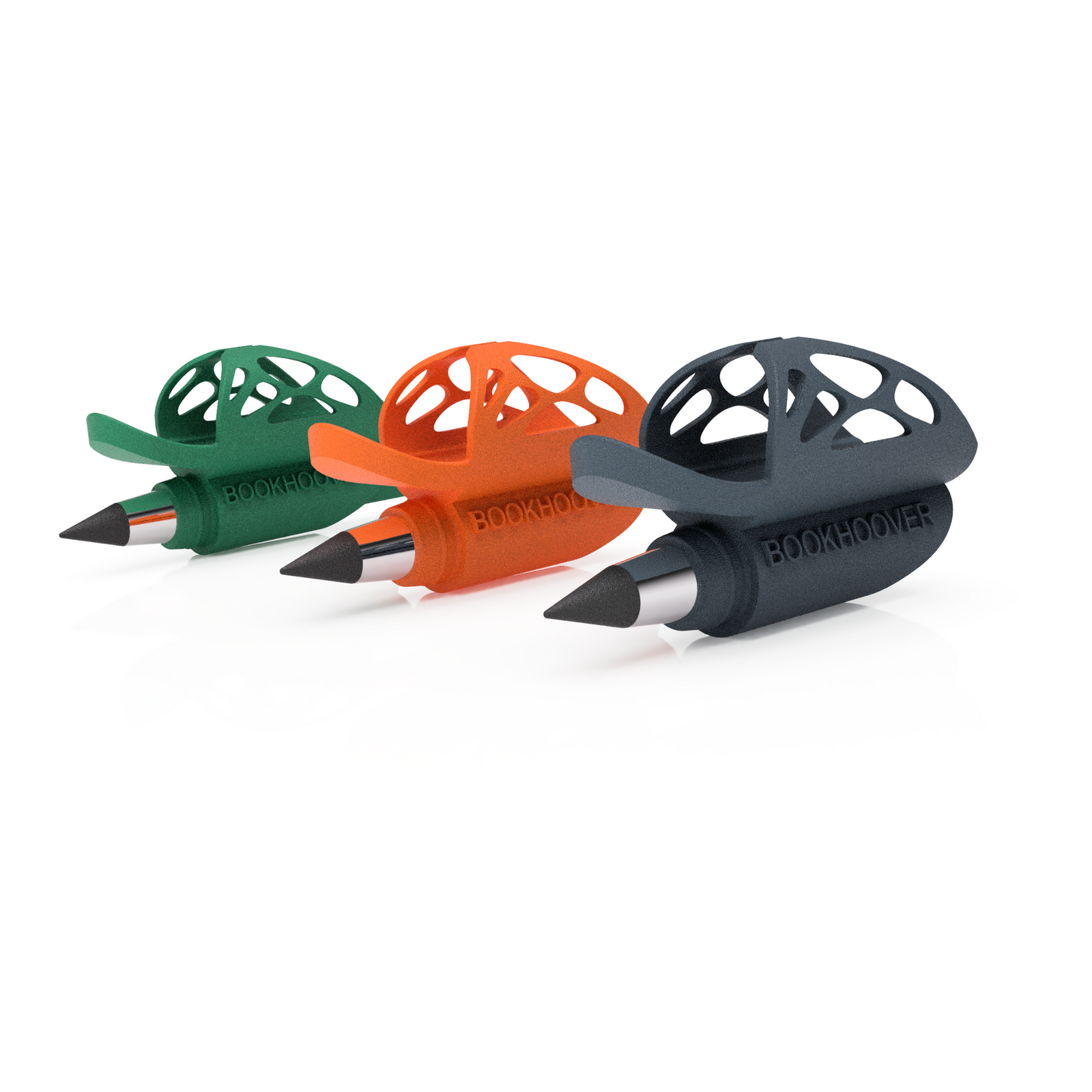 Der Bookhoover wird aus biokompatiblem PA12 3D gedruckt. Anschließend werden die jeweiligen Stiftminen von uns händisch eingesetzt und vervollständigen das Lese-Werkzeug. Dank modernster additiver Fertigung lässt sich so ein völlig neues haptisches Produkterlebnis kreieren.